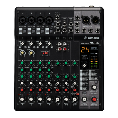 10通道调音台:4个话筒 / 10 个线路输入 (4 个单声道 + 3 个立体声) / 1 立体声母线 / 1 AUX (包括 FX)